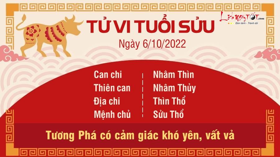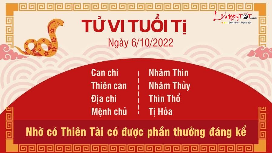 Nhờ có Thiên Tài mà con giáp tuổi Tị có thể củng cố quyền lực, tìm kiếm phần thưởng đáng kể cho mình, nhưng hãy chia sẻ nó với mọi người xung quanh. Lời khuyên quan trọng cho bạn là đừng quá duy tâm trong mọi việc, đôi khi cần lý trí hơn. Thổ - Hỏa tương sinh mang lại tin vui trong chuyện tình cảm để bản mệnh có thêm niềm tin mới, thế nhưng lần này bạn đón nhận mọi thứ với thái độ ung dung và thoải mái hơn. Những cặp đôi có nhiều thời gian trò chuyện để thấu hiểu nhau hơn. Ngày 6/10/2022 là ngày Ngày Vãng vong. Ngày này được xem là ngày xui xẻo, thế nên bản mệnh nên hạn chế đưa ra những quyết định quan trọng trong ngày này.