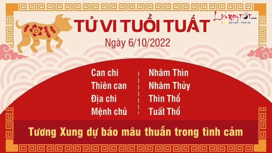 Thìn - Tuất Tương Xung dự báo mâu thuẫn trong tình cảm mà người tuổi Tuất không thể nào lường trước được. Nhưng hãy thông cảm cho những cảm xúc tiêu cực của đối phương vì có thể hiện tại cuộc sống của họ đang có chút khó khăn, bạn cố tranh cãi hơn thua cũng không nên chút nào. Thiên Quan dự báo nhiều việc đang đổ dồn và rối tinh, con giáp tuổi Tuất lúc này nên ưu tiên chất lượng hơn là số lượng. Nếu không bạn sẽ rơi vào tình huống càng làm càng sai nhiều. Cuộc sống tuy có nhiều xáo trộn và bạn không vui nhưng thực ra lại mang nhiều bài học nhất, giúp bạn nhanh trưởng thành nhất có thể. Do đó, đừng chỉ nhìn nhận, đánh giá vấn đề một chiều mà chuốc buồn tủi vào lòng nhé.