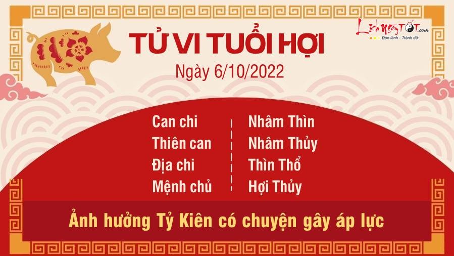 Ảnh hưởng của Tỷ Kiên nên một số chuyện từng xảy ra sẽ gây áp lực cho con giáp tuổi Hợi, khiến bạn nghĩ ngợi, căng thẳng. Đừng để những chuyện đã qua quấy rầy mình, nếu không bạn sẽ mệt mỏi và có xu hướng lặp lại sai lầm. Ngũ hành xung khắc nhắc nhở bản mệnh lưu ý tới khía cạnh tình cảm, đừng chỉ sống đơn giản cho ngày hôm nay. Trong một mối quan hệ, để có được sự lâu dài, bạn cần phải có sự nuôi dưỡng tình cảm từ cả hai phía. Ngày 6/10/2022 dương lịch là ngày Can Nhâm, không trị bệnh ở thận. Do đó, bản mệnh lưu ý điều này để tránh tác động lên vị trí này, hạn chế rắc rối có thể xảy ra.