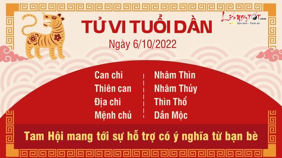 Hôm nay xuất hiện Tam Hội cho thấy sự hỗ trợ có ý nghĩa rất lớn với bạn bè của bạn ngày hôm nay. Vì thế, hãy cho họ thấy bạn ở bên cạnh vì họ. Đây là ngày thể hiện tấm lòng chân thành. Thực thần ghé thăm khuyên tuổi Dần chớ nên ép bản thân làm những việc mà bạn không muốn ngày hôm nay. Hãy chọn lựa những gì bạn thích, bởi vì nhờ như thế, và sẽ có một ngày vui vẻ, dễ chịu. Ngũ hành xung khắc cho thấy sức khỏe giảm sút và cần phải được nghỉ ngơi nhiều hơn. Đừng ôm đồm quá nhiều nhiệm vụ từ nơi công sở cho tới việc trong nhà, bạn nên biết để cho người khác hỗ trợ nếu không muốn mệt mỏi thêm.