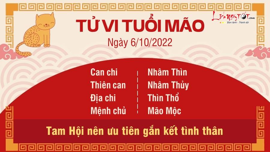Nhân khi có Tam Hội người tuổi Mão nên ưu tiên thời gian của mình cho việc gắn kết tình thân. Những buổi ăn uống gặp gỡ cùng mọi người mang lại cho bạn năng lượng tích cực hơn trong cuộc sống. Thương Quan hối thúc khiến con giáp tuổi Mão có xu hướng nói mà không nghĩ, gây tổn thương cho những người xung quanh. Đôi khi dù bạn biết sự thật nhưng cũng nói giảm nói tránh để người ta bớt buồn nhé. Ngũ hành xung khắc cho thấy các trách nhiệm công việc, gia đình có thể đòi hỏi khá nhiều ngày hôm nay, nhưng đừng vì thế mà quên dành thời gian để nạp năng lượng. Cho mình những khoảng lặng thư giãn giúp bạn lấy lại năng lượng tinh thần.