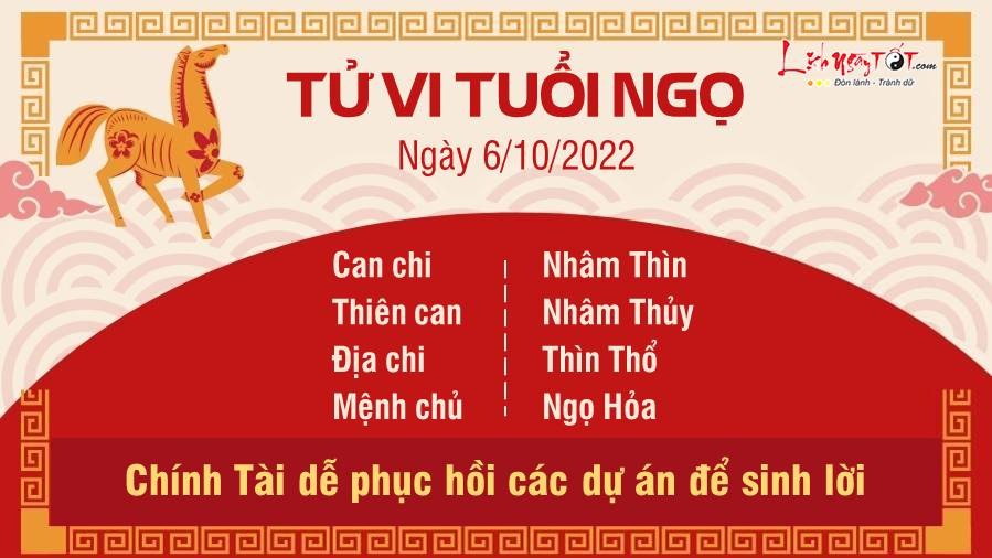 Chính Tài ghé thăm cho thấy con giáp tuổi Ngọ có cơ hội kiếm tiền, phục hồi các dự án để sinh lời. Khả năng phán đoán tốt là hậu thuẫn, vì thế, hãy chủ động để ý đến những tin tức có lợi cho mình. Thổ - Hỏa tương sinh mang lại cơ hội mà chính bạn trước đây còn chưa ngờ tới, hãy trân trọng những gì đáng có, tuy nhiên cũng nên có kế hoạch sắp xếp để tối ưu lại cuộc sống của mình. Thế nhưng đừng vì thuận lợi hơn một chút mà đã chủ quan nhé. Ngày tốt theo Nhị thập bát tú khuyên bản mệnh nên ưu tiên những việc như: Tạo dựng nhà phòng, nhập học, ra đi cầu công danh, cắt áo.