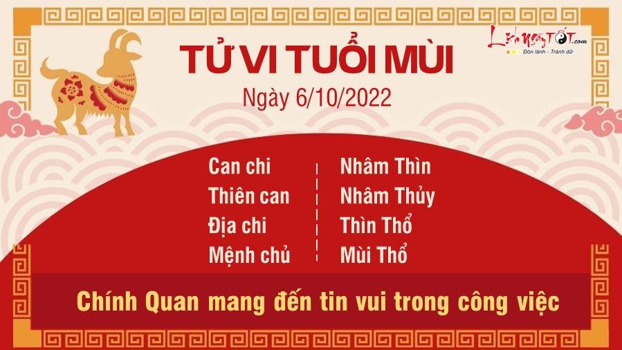 Chính Quan mang đến tin vui trong công việc cho con giáp tuổi Mùi. Bạn đã rất nỗ lực để đạt được những thành quả nhất định, tại sao không ăn mừng điều đó? Bạn xứng đáng có được một phần thưởng nho nhỏ cho công sức của mình đã bỏ ra. Thổ khí vượng ảnh hưởng tiêu cực tới sức khỏe của bản mệnh, có thể là bệnh cũ tái phát hoặc gặp bệnh theo mùa. Dù thế nào bạn cũng nên ngủ sớm vì đó cũng là cách để hỗ trợ cho hệ miễn dịch của bạn hoạt động tốt hơn, chống đỡ lại bệnh tật. Hôm nay theo dân gian là ngày nên kiêng cữ: Chôn cất, khai trương, trổ cửa dựng cửa, khai thông đường nước, đào ao móc giếng, thưa kiện, đóng giường lót giường. Do đó, bản mệnh lưu ý không nên tiến hành những việc trên trong hôm nay nhé.