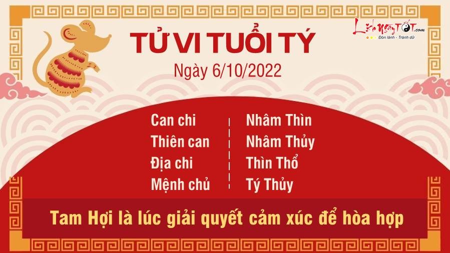 Hôm nay có Tam Hợp là cơ hội để giải quyết các vấn đề về cảm xúc cá nhân, cải thiện sự hòa hợp với người yêu, gia đình, bạn bè. Bạn có thể nhận được tin vui hoặc đón nhận sự quan tâm của một nhân vật đặc biệt nào đó. Người tuổi Tý đừng bốc đồng, nghĩ gì nói nấy trong ngày có Kiếp Tài tác động tới tâm lý của bạn. Hôm nay, bạn nên lắng nghe nhiều hơn là chia sẻ, bởi nói nhiều quá bạn sẽ không có thời gian để nghĩ xem điều gì mới là chính xác. Thổ - Thủy xung khắc khuyên bản mệnh luôn đề cao cảnh giác các kế hoạch tiền bạc của mình, tránh chi tiêu lãng phí vì những món đồ không mang lại nhiều giá trị, chỉ thỏa mãn sở thích của bạn. Nên ưu tiên việc tiết kiệm để đề phòng khi rơi vào khó khăn.