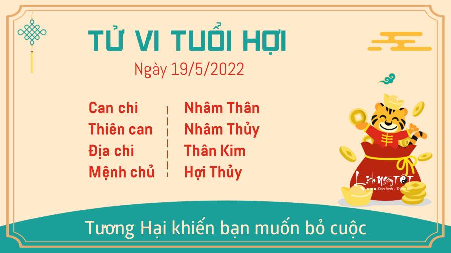 Dự đoán vận trình công việc người tuổi Hợi không được thuận lợi, gặp nhiều áp lực. Những rắc rối vô tình tìm đến làm cản đường Hợi trong công việc của ngày 19/5. Tuy nhiên, bản mệnh vẫn giữ được sự bình tĩnh nên kiểm soát tình hình rất tốt, đồng thời xem nó như là bài học kinh nghiệm cho mình.
