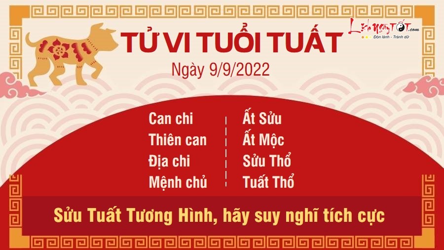 Sửu Tuất Tương Hình khuyên người tuổi Tuất hãy dùng tâm lý tích cực hơn khi đối diện với những điều không mong muốn trong cuộc sống, bởi chẳng phải lúc nào mọi việc cũng thuận lợi như dự kiến của bạn đâu. Trong gia đình, bạn không nên trút hết những nóng nảy, bực bội trong người lên đầu người ấy. Ngược lại, hãy tâm sự san sẻ với người ấy, bạn sẽ thấy lòng nhẹ nhõm hơn nhiều. Hơn nữa, người ấy cũng có thể đưa ra cho bạn những gợi ý hữu ích đấy. Thổ vượng cũng khuyên bản mệnh nên quan tâm hơn đến tình hình sức khỏe của bản thân, chớ nên làm việc quá sức, đặc biệt nếu bạn đã cao tuổi. Đồng thời, bạn cũng nên có chế độ sinh hoạt điều độ, hạn chế ăn đồ quá cay nóng hoặc nhiều dầu mỡ.