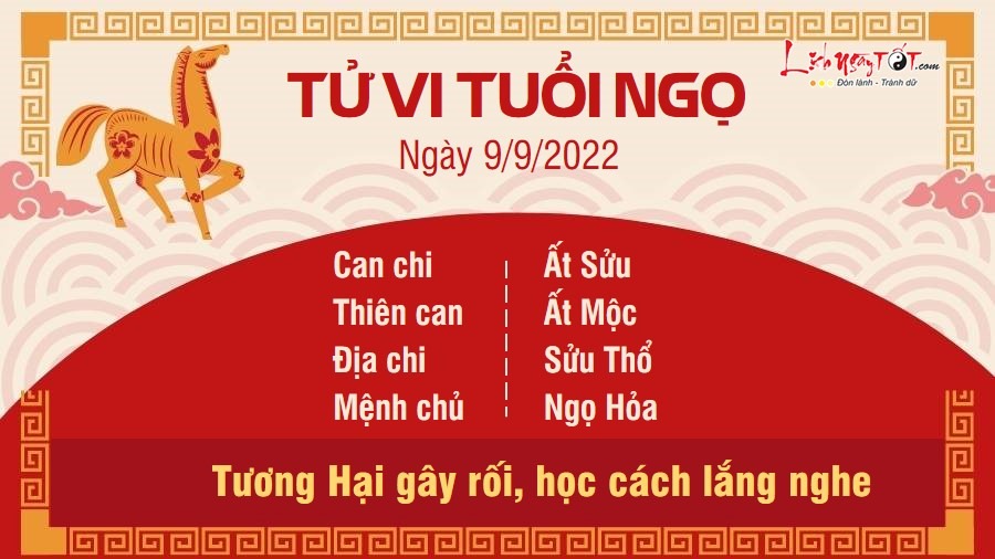 Cục diện Tương Hại gây rối, người tuổi Ngọ nên học cách lắng nghe góp ý của mọi người, bởi nhiều khi người khác sẽ để ý tới những khía cạnh mà bạn vô tình bỏ qua. Chỉ khi chịu lắng nghe, bạn mới có thể tiến bộ được. Chuyện làm ăn kinh doanh cũng vướng phải nhiều khó khăn trong ngày hôm nay. Xung quanh bạn có nhiều đối thủ đang tìm cách chơi xấu, vì thế hãy luôn cẩn thận trong từng đường đi nước bước, nếu không sẽ dễ mất tiền hao của. Hỏa sinh Thổ cho thấy người độc thân đã dần có những suy nghĩ tích cực hơn trong chuyện tình cảm. Thái độ cởi mở cũng khiến bạn trở nên hấp dẫn hơn hẳn trong mắt người khác. Rất có thể sẽ có người chủ động tiếp cận bạn đấy.