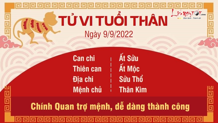 Chính Quan trợ mệnh, người tuổi Thân có thể gặt hái được thành công mà không cần phải đấu tranh hay cố gắng quá nhiều. Tuy nhiên, bản mệnh đừng vì đạt được mọi thứ quá dễ dàng mà thành ra coi thường, không biết trân trọng nhé. Nếu công việc của bạn không quá bận rộn trong ngày hôm nay, bạn có thể dành thời gian để học thêm những kiến thức mới mẻ, làm phong phú bản thân mình hoặc giúp đỡ mọi người. Những việc ấy sẽ giúp bạn bước những bước vững chắc hơn trên con đường thăng tiến. Thổ sinh Kim, bản mệnh và nửa kia được tận hưởng một ngày tràn đầy hạnh phúc. Đôi bên có thể hâm nóng tình cảm hoặc tạo thêm những kỉ niệm khó quên bằng cách cùng nhau nấu một bữa cơm thịnh soạn hoặc ra ngoài thay đổi không khí.