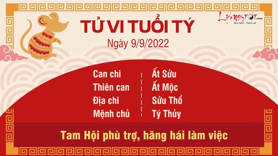 Tam Hội nâng đỡ, người tuổi Tý có một ngày tràn đầy hăng hái. Bạn mạnh dạn bày tỏ ý kiến của mình cho mọi người được biết với hi vọng rằng suy nghĩ của mình có thể hữu ích cho sự phát triển của tập thể. Người làm ăn kinh doanh cũng sẽ thu về một khoản kha khá trong ngày hôm nay. Bạn nhận được khoản lãi lời từ những mối đầu tư trước đó. Đồng thời, một vài người tìm ra con đường mới và trở thành người dẫn đầu xu hướng. Tuy nhiên, Thổ khắc Thủy cho thấy giữa bạn và nửa kia của mình còn nhiều điều mâu thuẫn với nhau. Hai người nên thẳng thắn trò chuyện và giải quyết những vấn đề còn tồn tại chứ đừng tìm cách lảng tránh, khiến tình cảm ngày một xa cách.