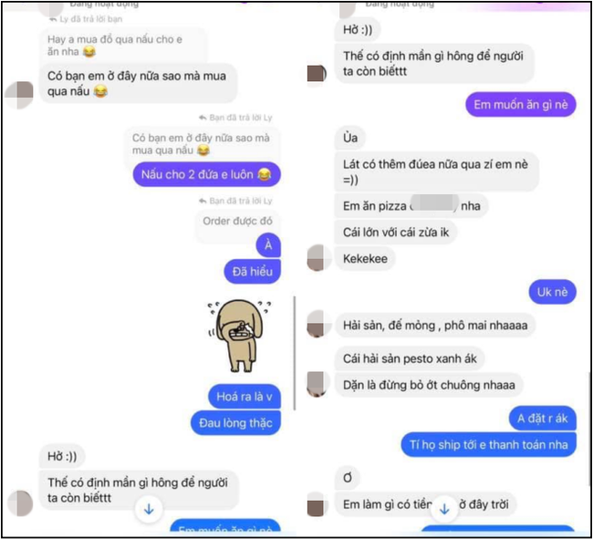 Nhưng bạn ấy bảo muốn nhờ mình đặt đồ ăn giúp, bạn gọi 2 cái pizza cỡ vừa và cỡ to. Mình nhận lời đặt giúp ngay, sau đó có nhắc nhở cô ấy thanh toán khi nhận hàng thì bạn bảo không có tiền mặt, nhờ mình đặt giúp vì thẻ bị lỗi, xong block mình.