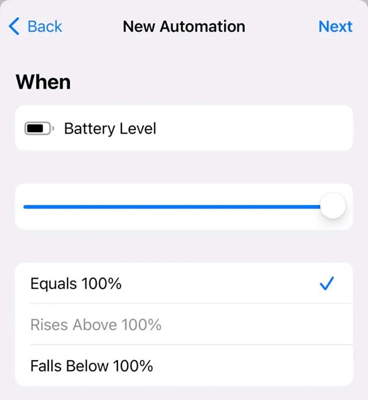- Chọn tùy chọn Battery Level. Để chế độ Equals % và trượt tới 100% (hoặc bất kỳ mức nào người dùng có thể muốn).