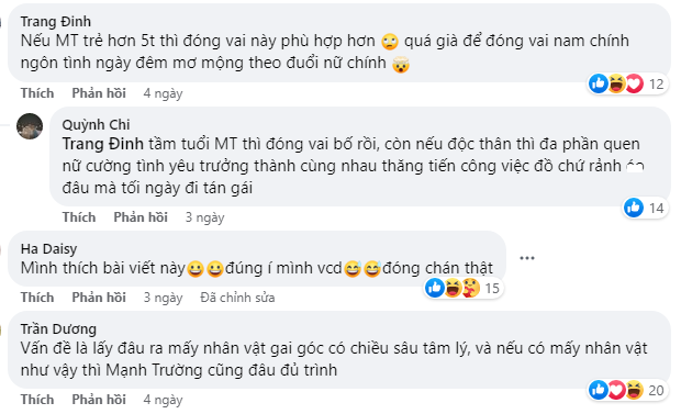 Có ý kiến so sánh anh với đồng nghiệp cùng lứa như Hồng Đăng, Việt Anh, khuyên Mạnh Trường nên thay đổi, tìm đến vai diễn có nhiều màu sắc tâm lý. Lời thoại của nhân vật Quy cũng bị cho là sến sẩm, không thực tế.