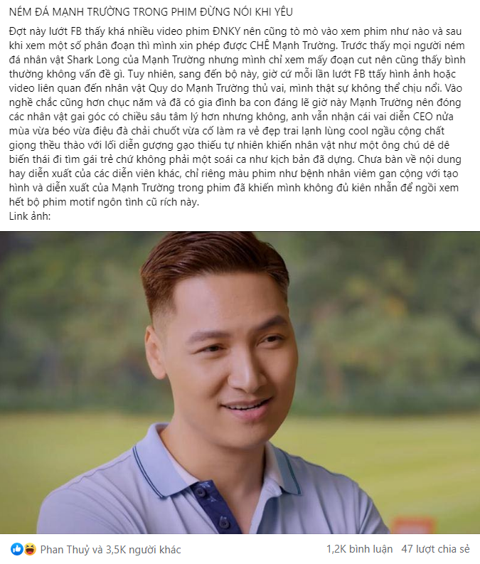 Bên cạnh những ý kiến chê bài, nhiều khán giả vẫn ủng hộ vai diễn mới của Mạnh Trường. Chặng đường còn lại của 'Đừng nói khi yêu' vẫn còn khá dài, khán giả vẫn chờ đợi vào sự mới mẻ trong diễn xuất của Mạnh Trường ở những tập tiếp theo.