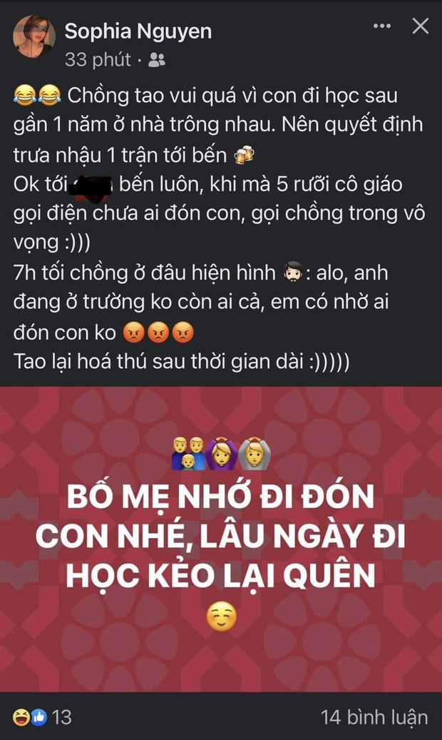 Chia sẻ thêm về tình huống cười ra nước mắt, chị Sophie tâm sự: “Chồng mình đến trường rồi còn gọi liên tục nhưng mình tức không nghe, lại còn hỏi hồn nhiên ai đón con nữa chưa”.