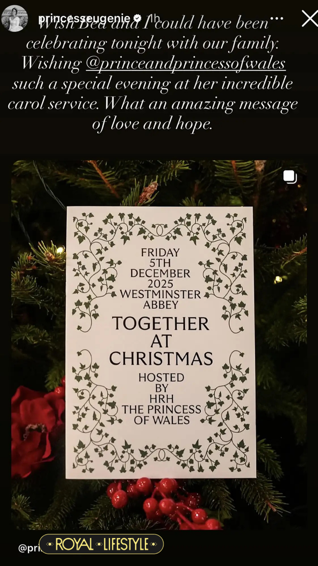 Không chỉ dừng lại ở việc bày tỏ sự tiếc nuối, Eugenie còn dành những lời chúc tốt đẹp nhất đến người chị dâu đang là tâm điểm của sự kiện. Cô viết tiếp: "Chúc @princeandprincessofwales (tài khoản chính thức của Thân vương và Vương phi xứ Wales) có một buổi tối thật đặc biệt tại buổi lễ thánh ca tuyệt vời này. Thật là một thông điệp tuyệt vời về tình yêu và niềm hy vọng". Động thái này được xem là cực kỳ tinh tế và khéo léo. Trong bối cảnh Vương phi Kate vừa trải qua một năm đầy thử thách về sức khỏe và đây là sự kiện đánh dấu sự trở lại mạnh mẽ của cô, lời động viên từ xa của Eugenie như một cái ôm ấm áp, khẳng định sự ủng hộ tuyệt đối của các thành viên trong gia đình dành cho nhau, dù họ không thể kề vai sát cánh ngay tại thời điểm đó.
