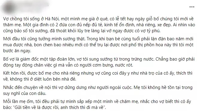 Vợ chồng tôi sống ở Hà Nội, một mình mẹ già ở quê, có lễ tết hay ngày giỗ bố chúng tôi mới về thăm mẹ. Một gia đình có 2 đứa con đủ nếp đủ tẻ, kinh tế ổn định, nhà riêng, xe đẹp. Ai nhìn vào cũng bảo số tôi sướng, đã thoát khỏi lũy tre làng lại vớ ngay được cô vợ tỷ phú.