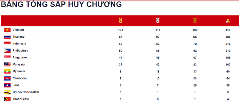 Việt Nam đã có một kỳ đại hội thể thao thành công rực rỡ. Với 205 HCV, Việt Nam xác lập kỷ lục mới và vượt xa kỷ lục mà đoàn Indonesia từng lập tại SEA Games Jakarta 1997, với 194 HCV.