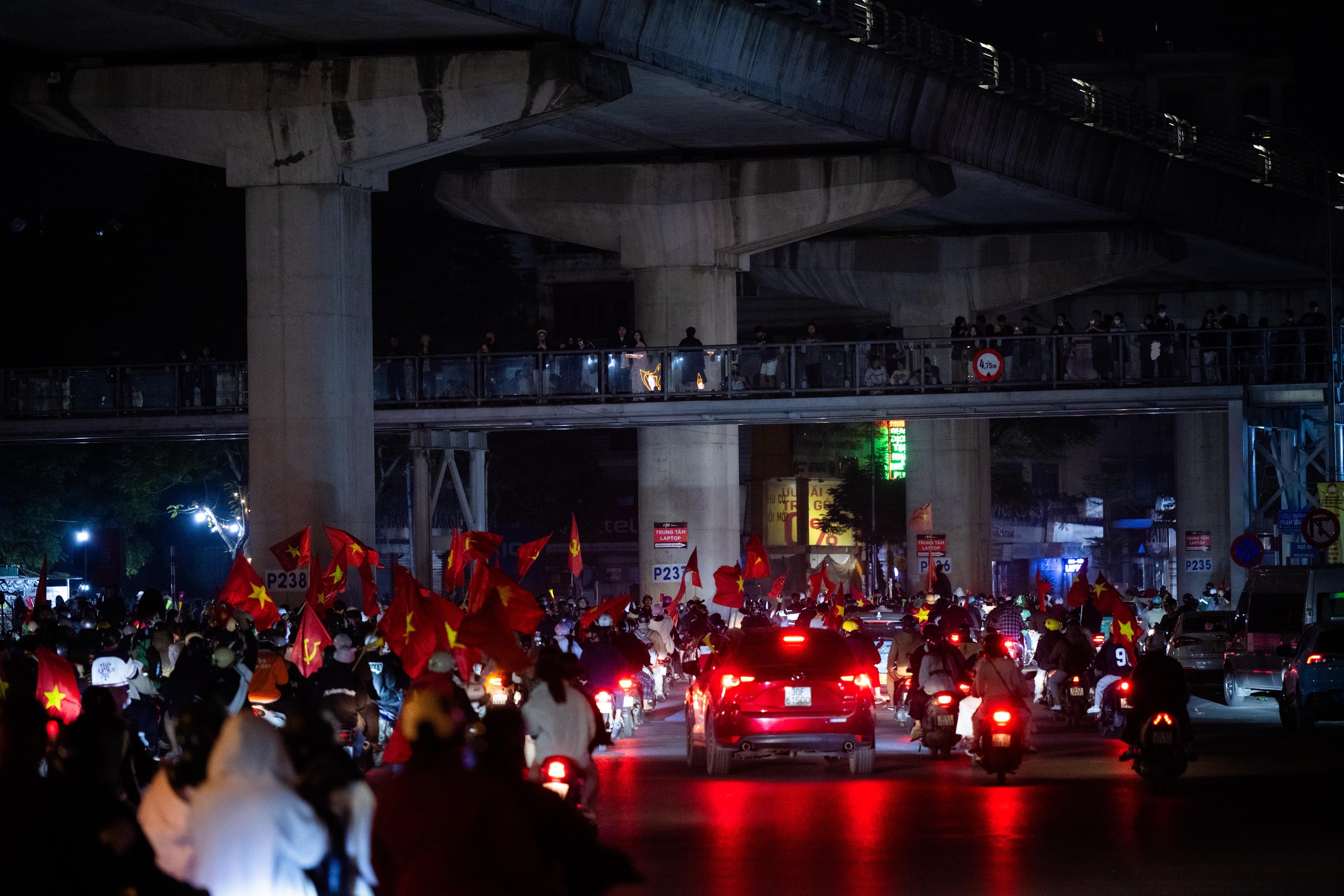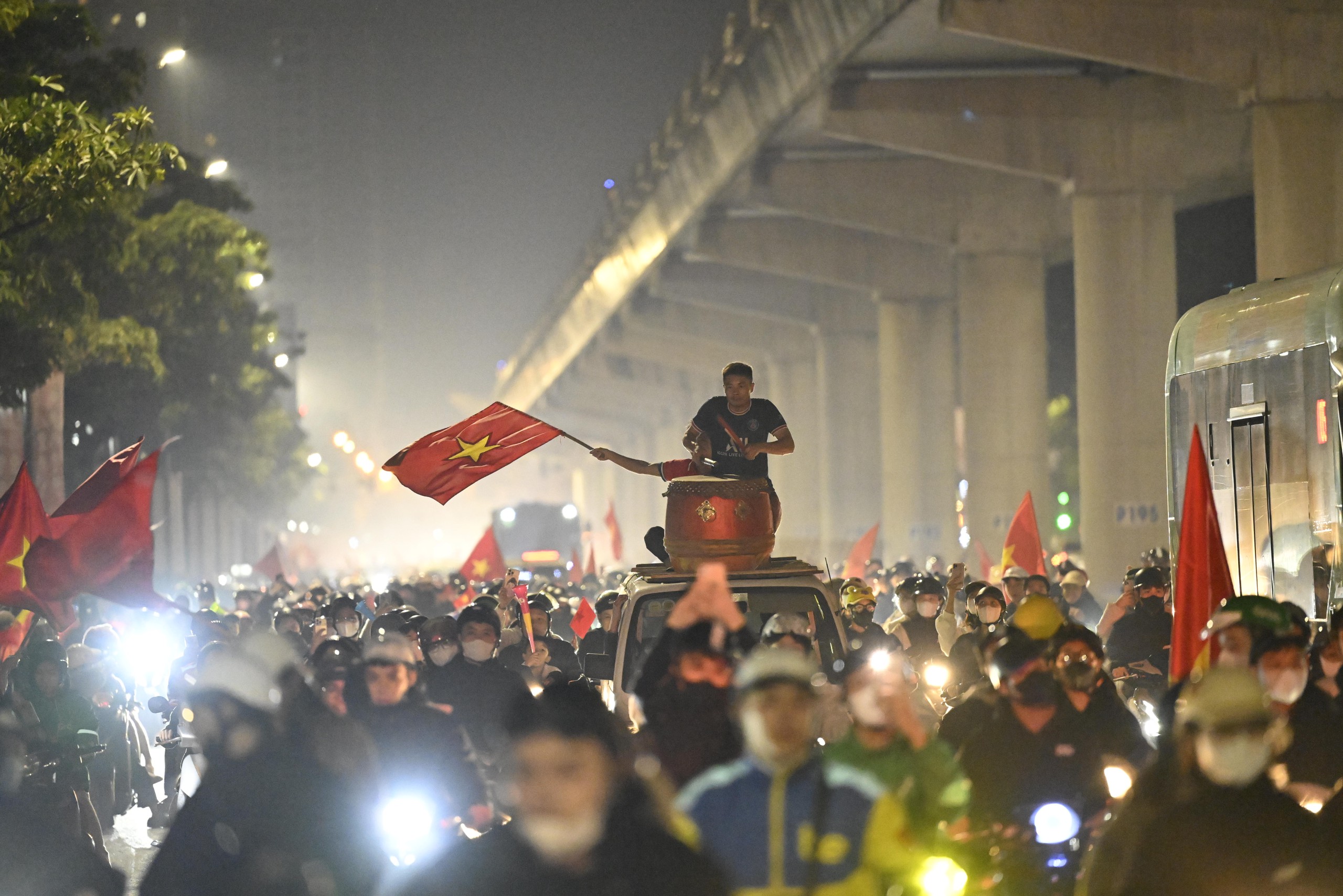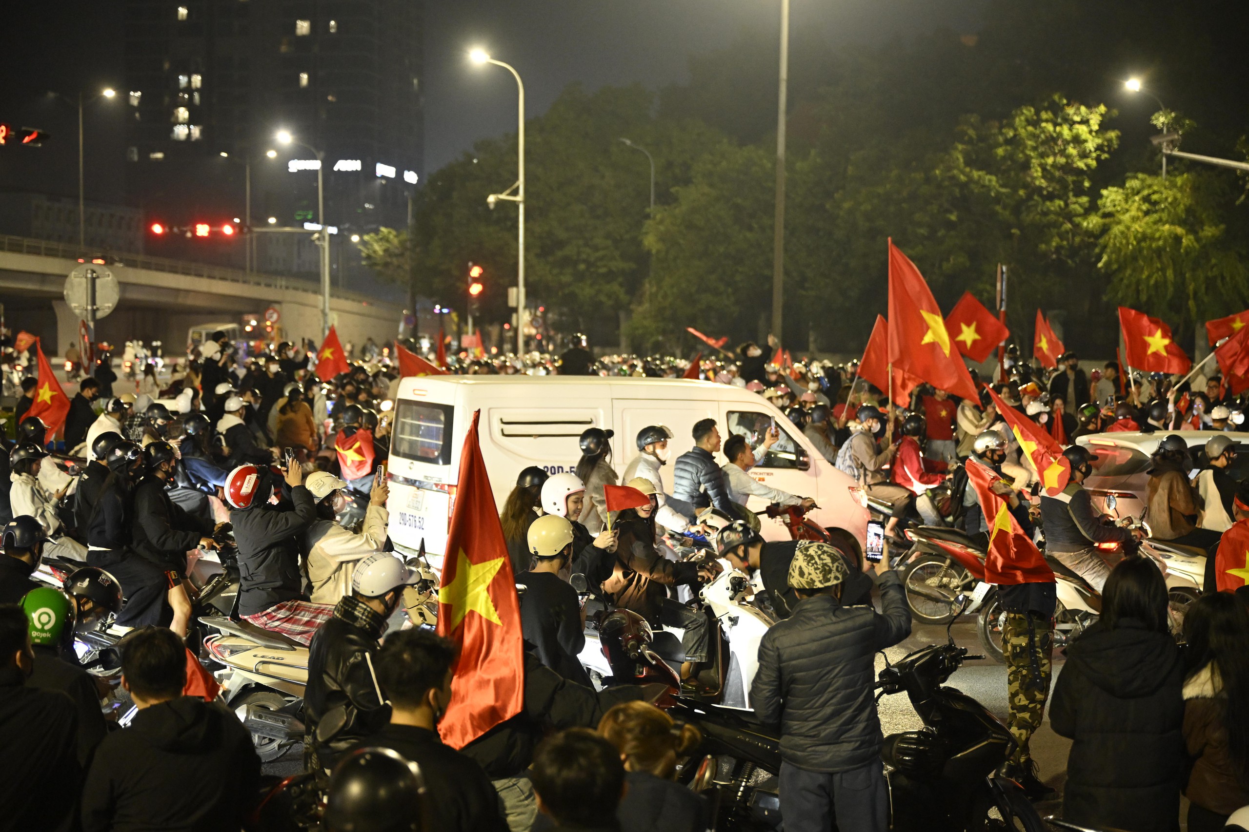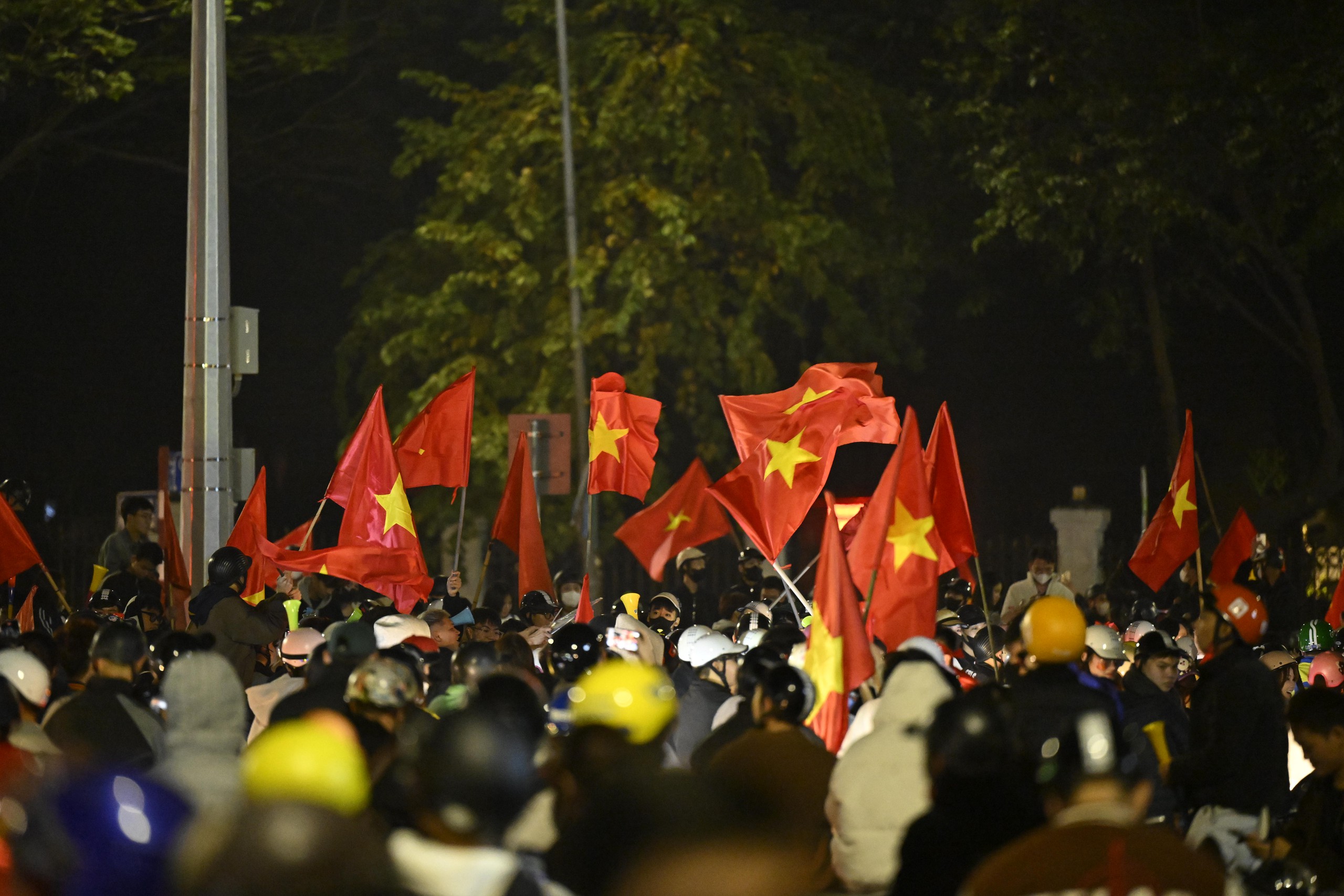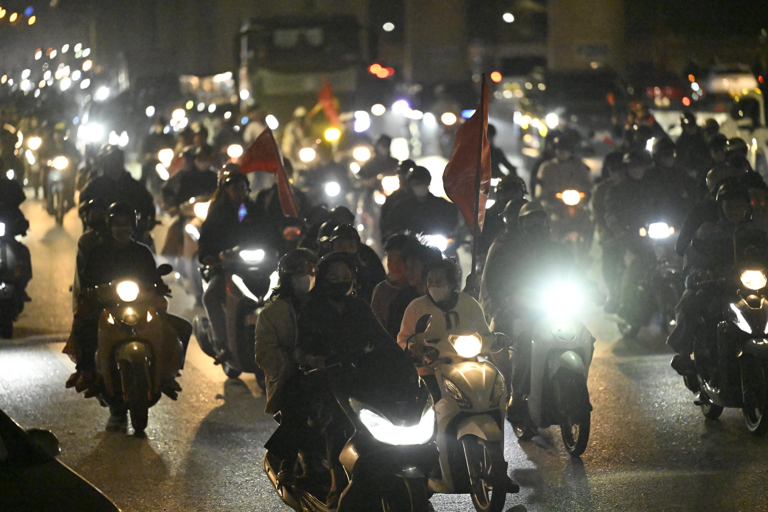 Niềm vui chiến thắng khiến người hâm mộ quên cả thời gian, phố xá rực rỡ cờ đỏ sao vàng.