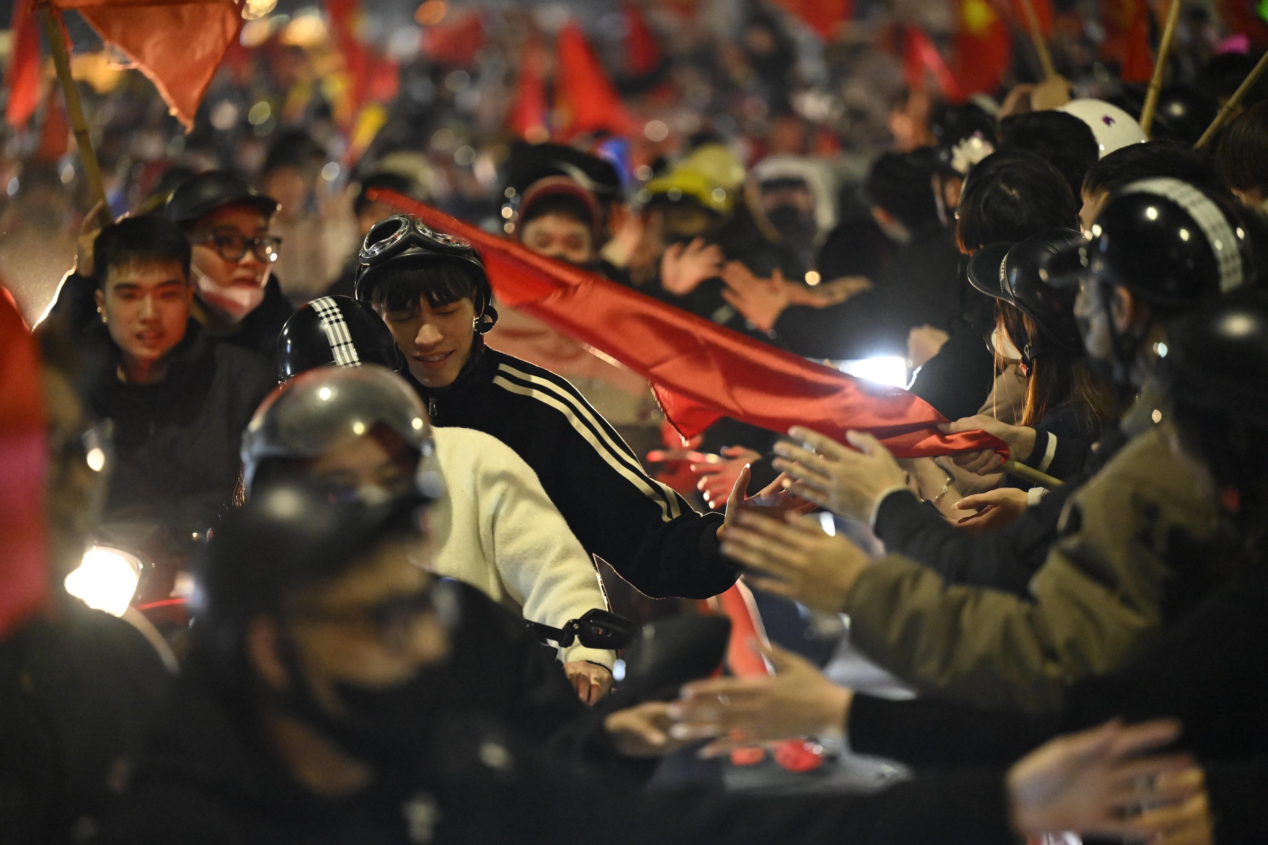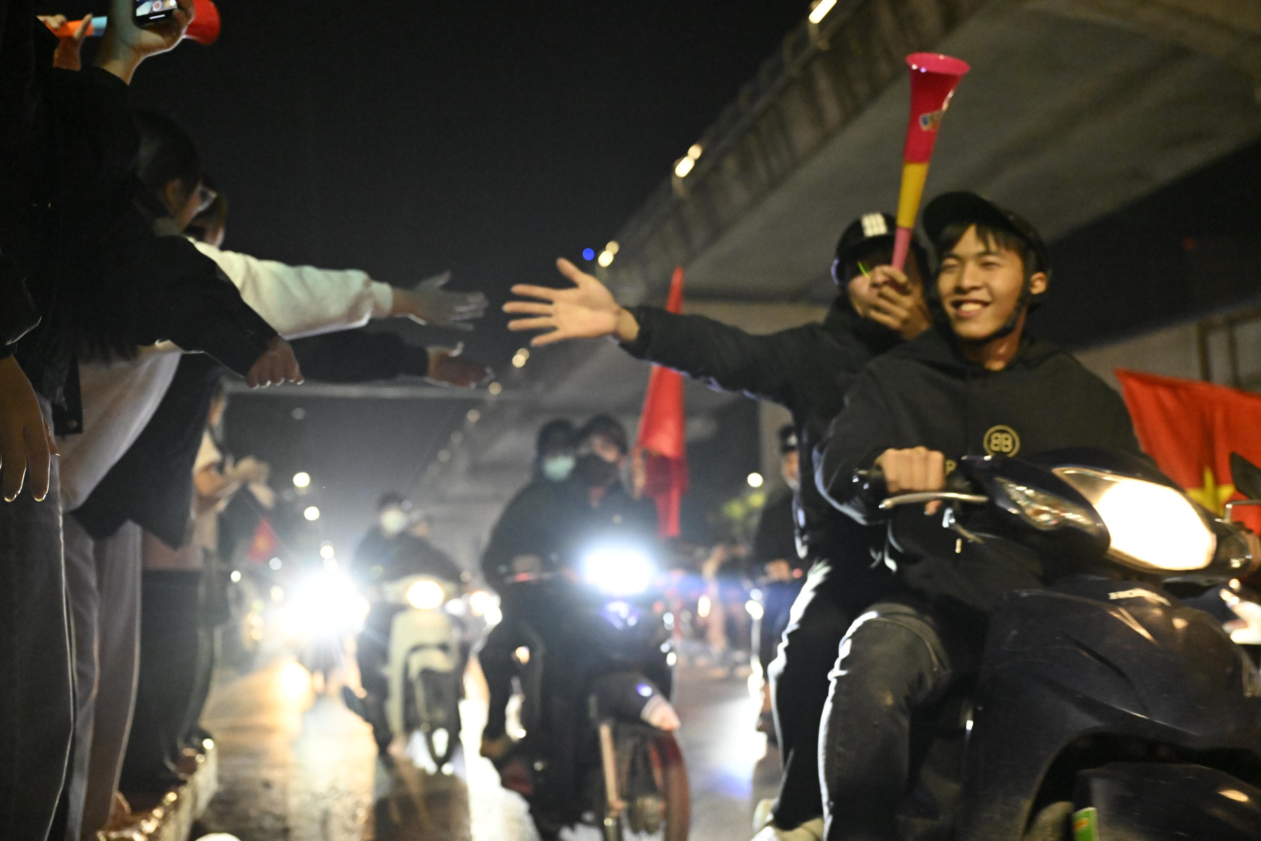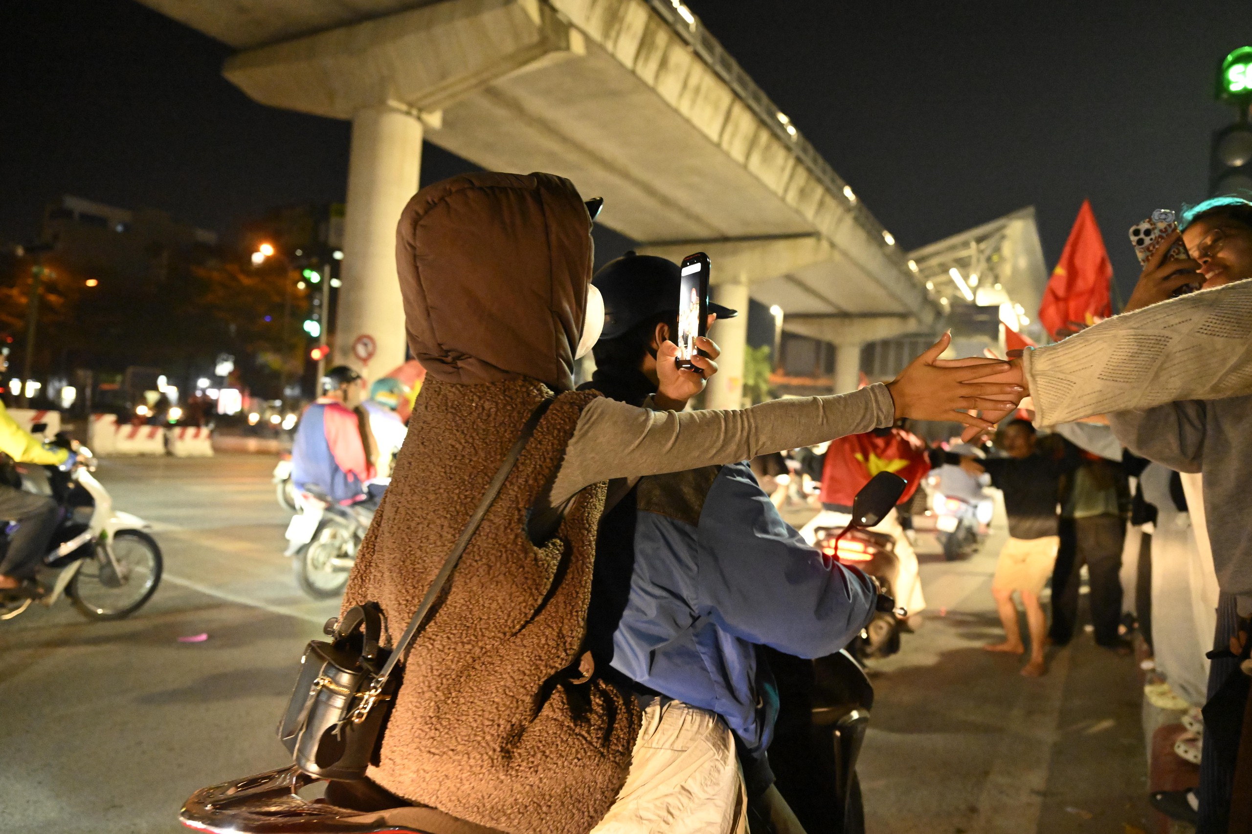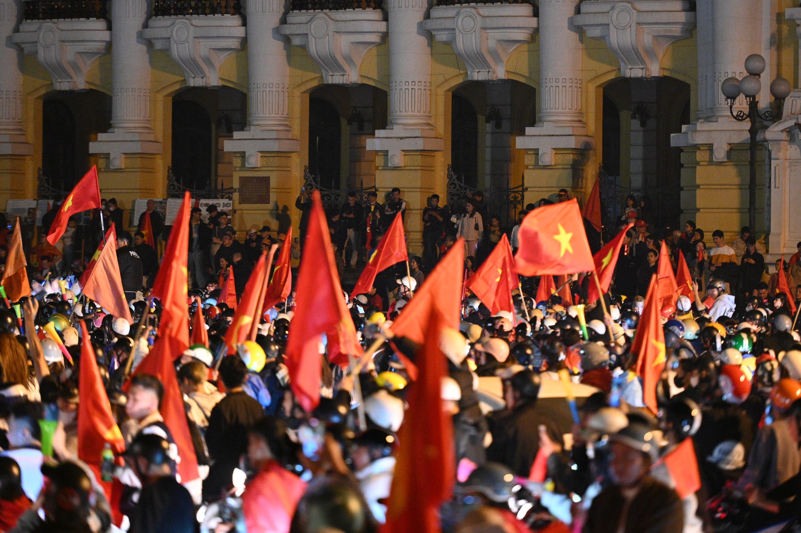 Niềm vui chiến thắng khiến người hâm mộ quên cả thời gian, phố xá rực rỡ cờ đỏ sao vàng.