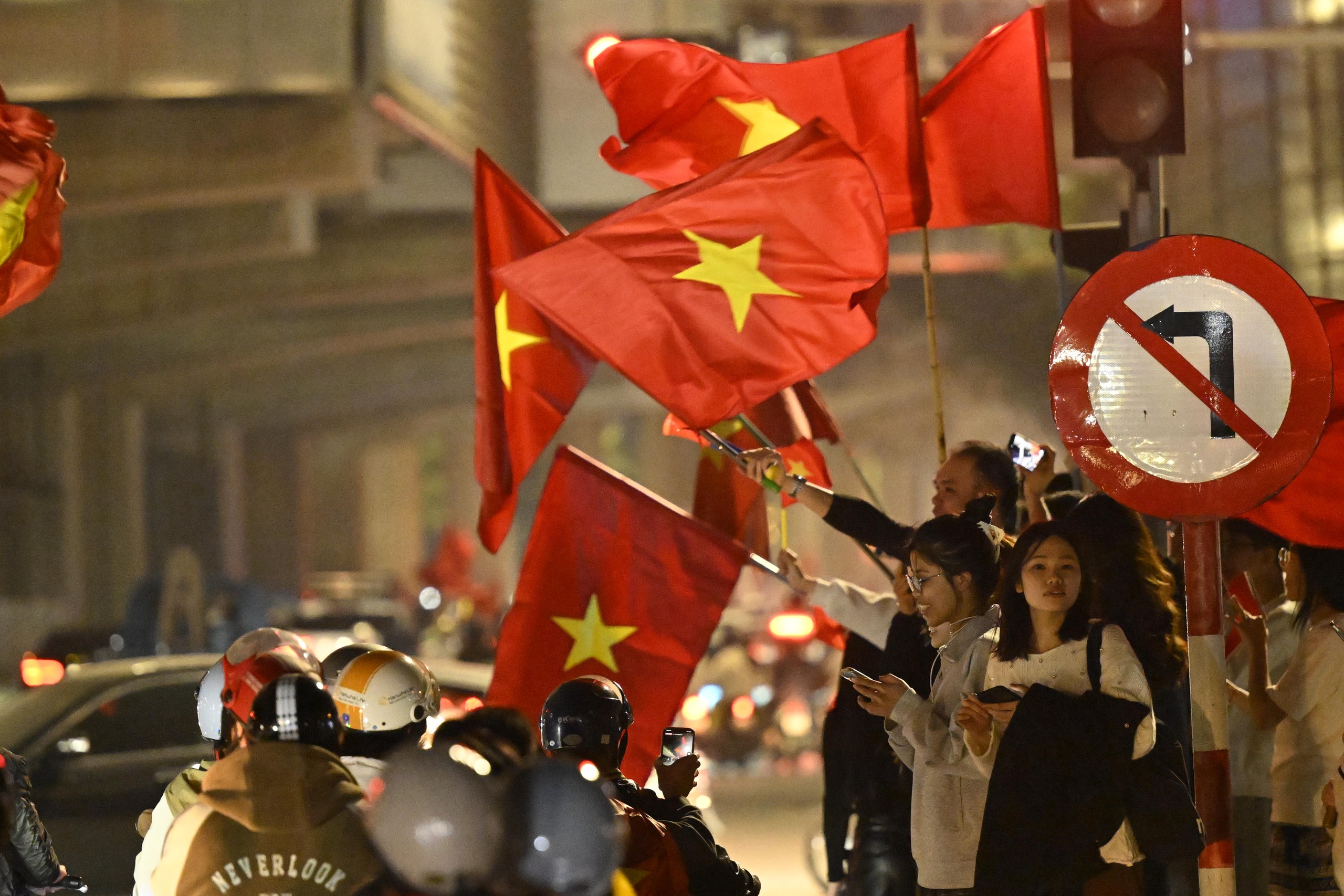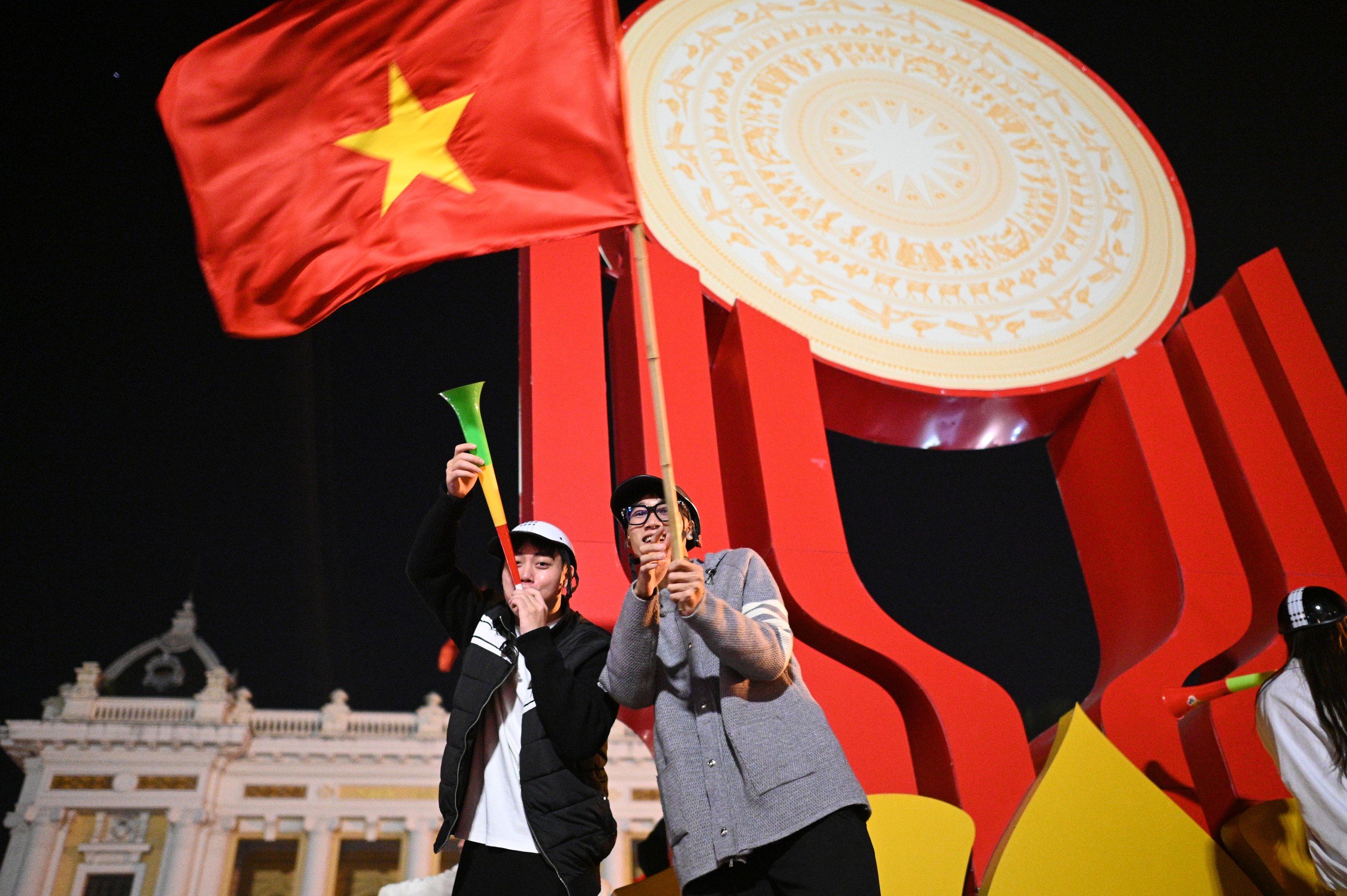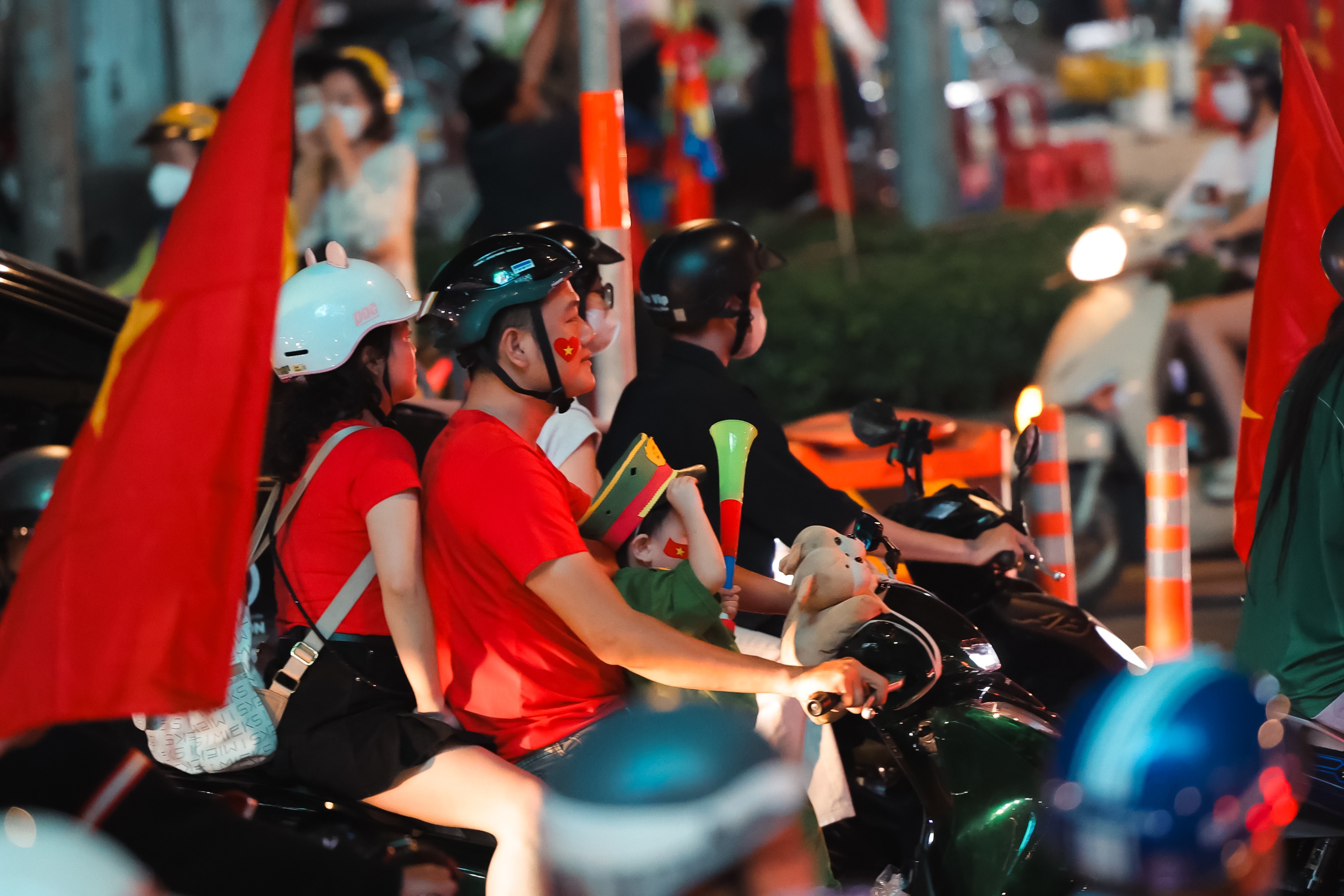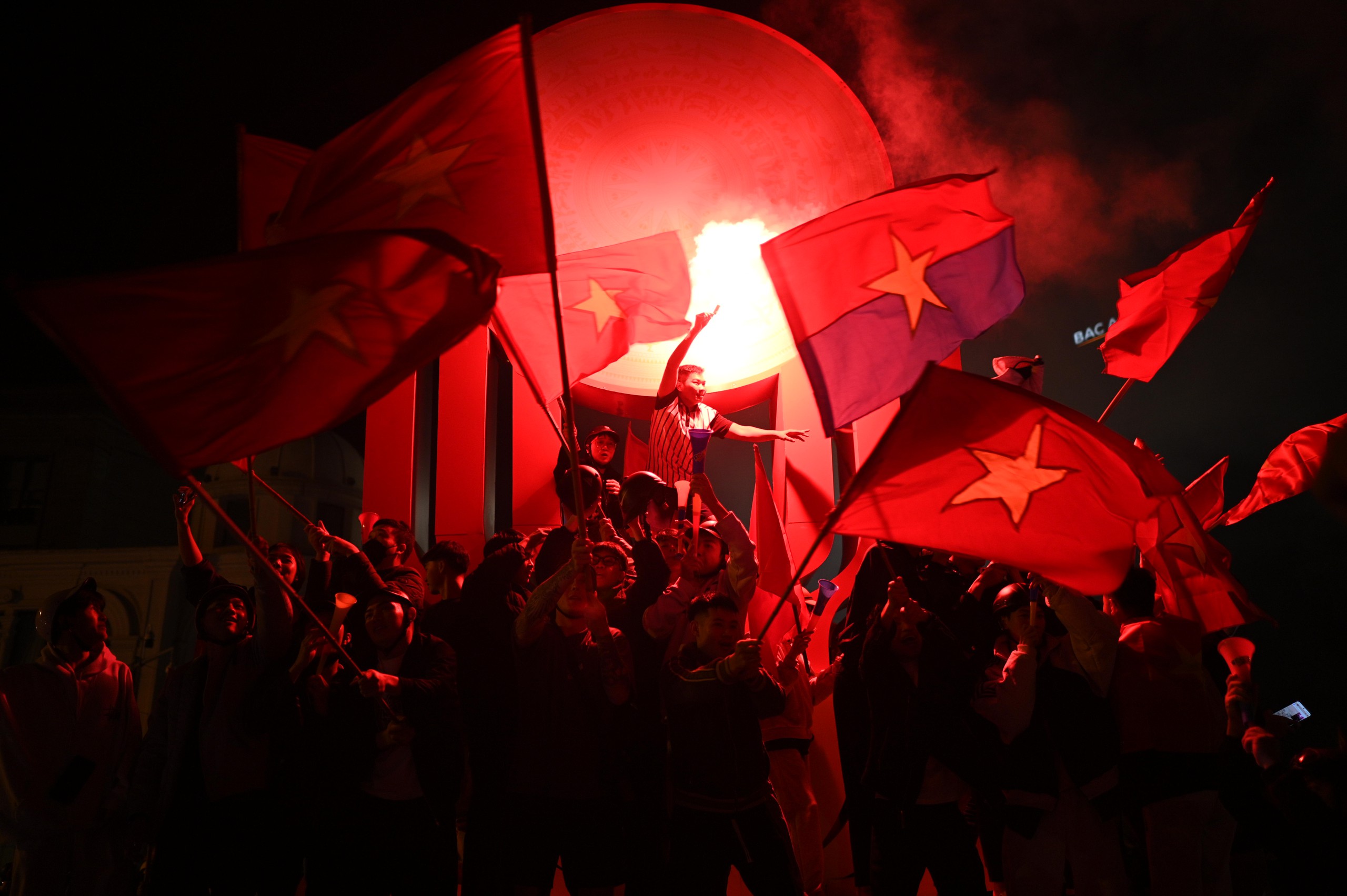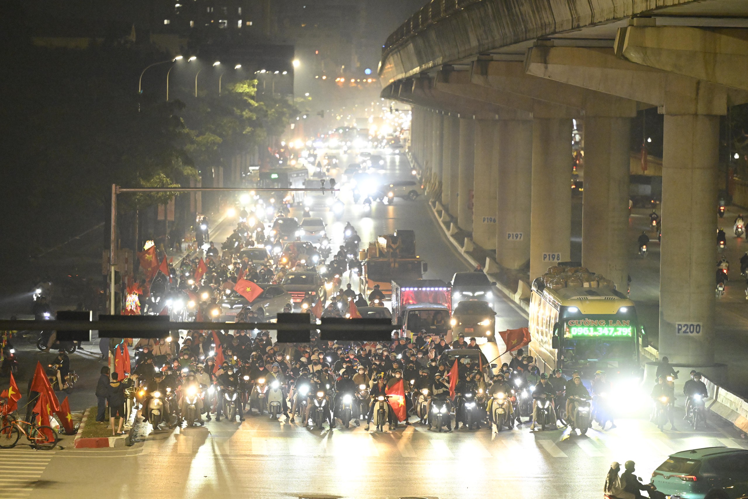 Niềm vui chiến thắng khiến người hâm mộ quên cả thời gian, phố xá rực rỡ cờ đỏ sao vàng.