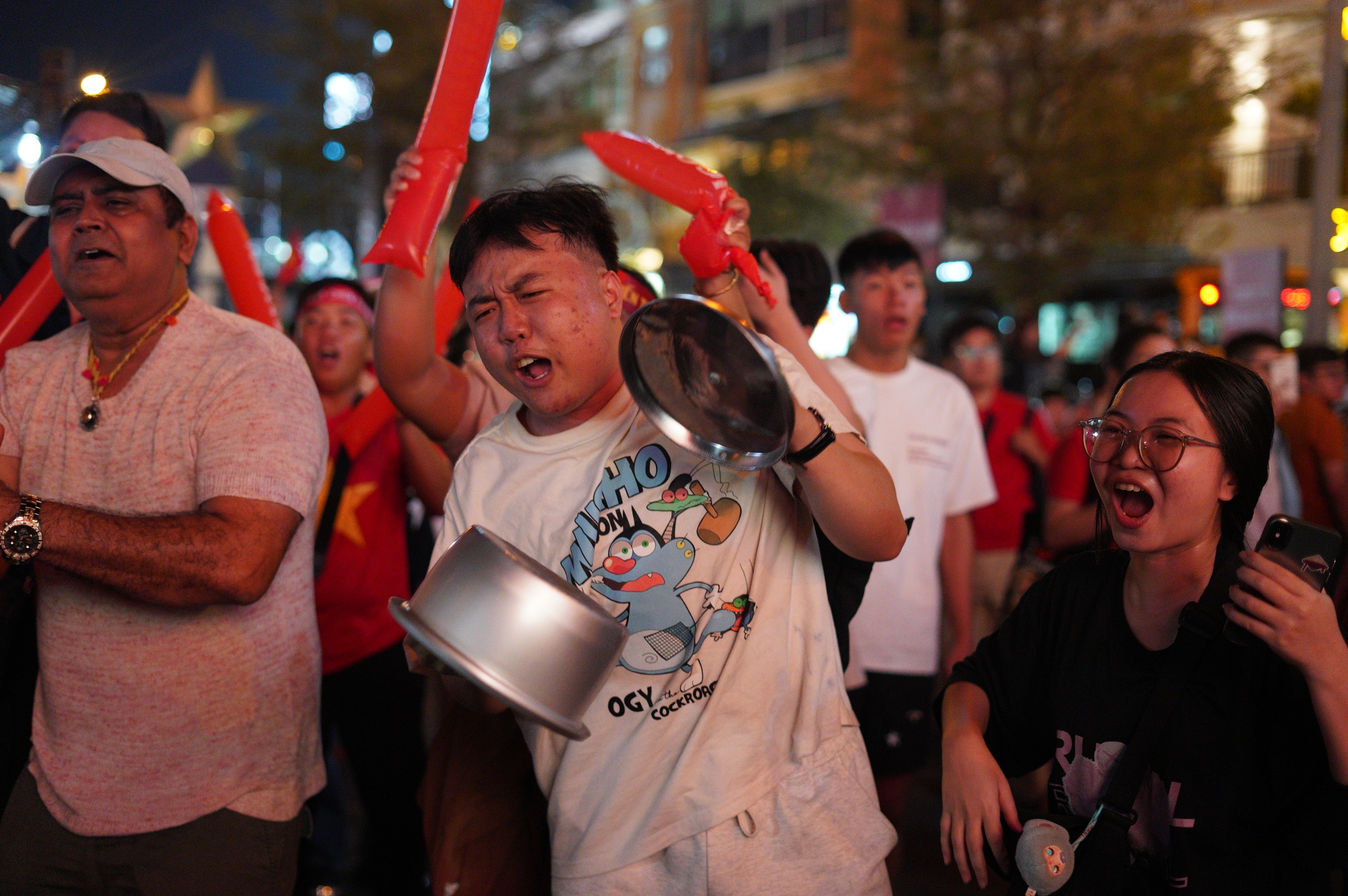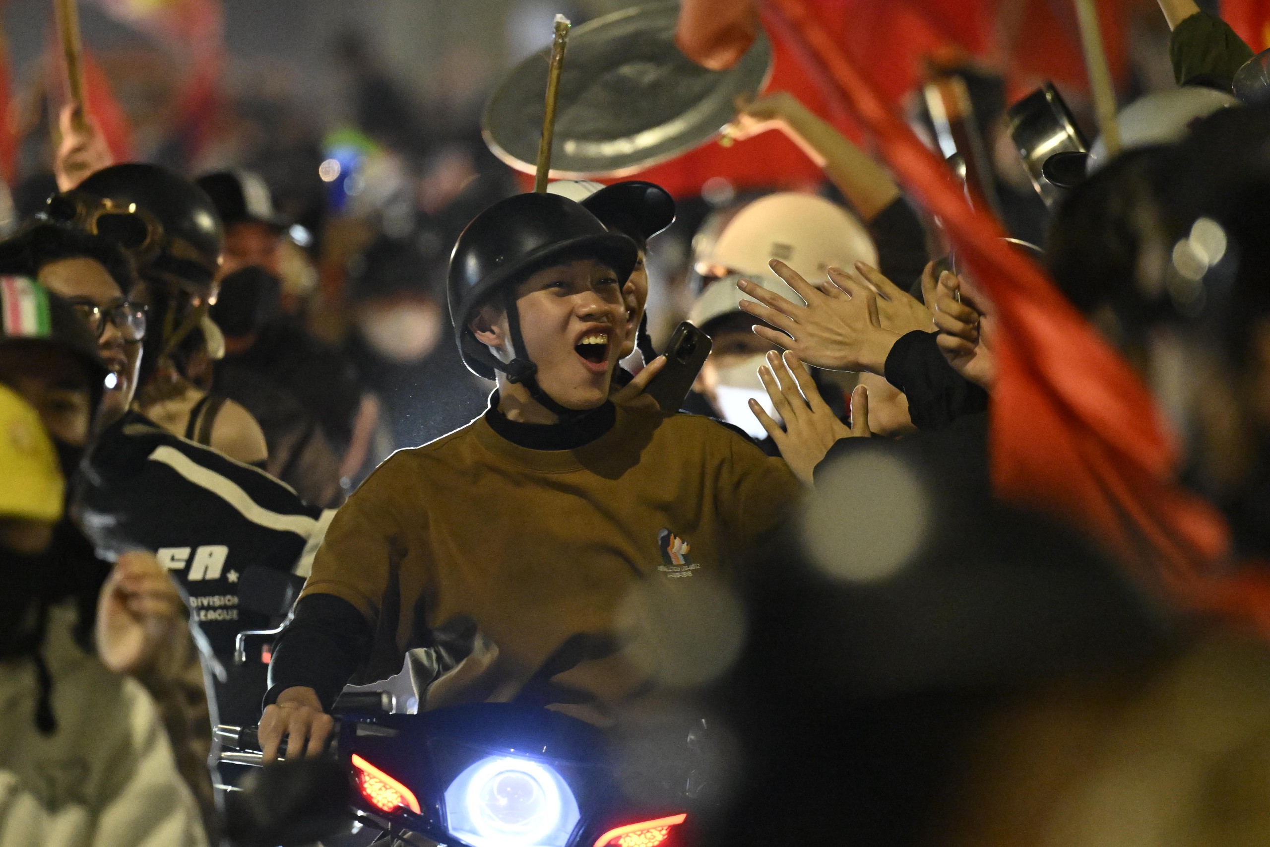 Tiếng trống, còi và tiếng hô vang "Việt Nam vô địch" hòa cùng ánh đèn đường, tạo nên khung cảnh ăn mừng đầy sôi động giữa đêm khuya.