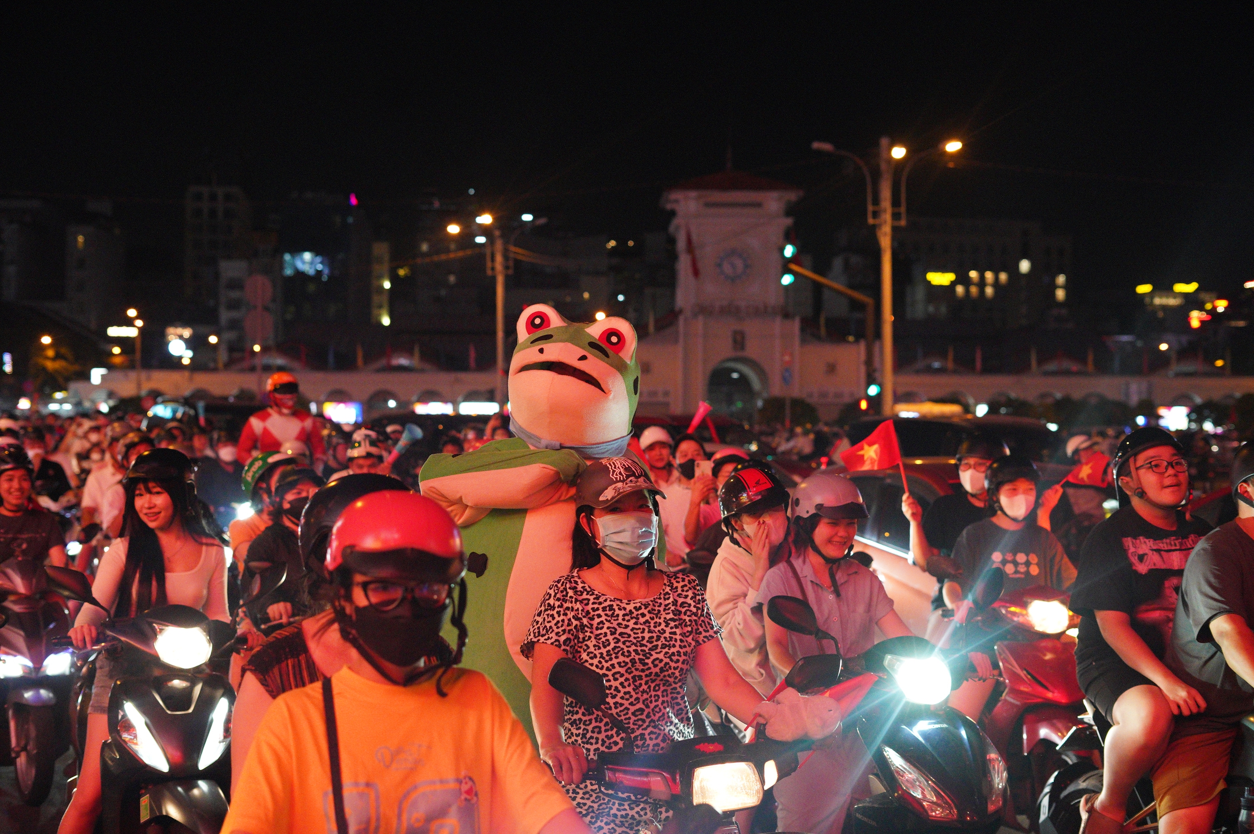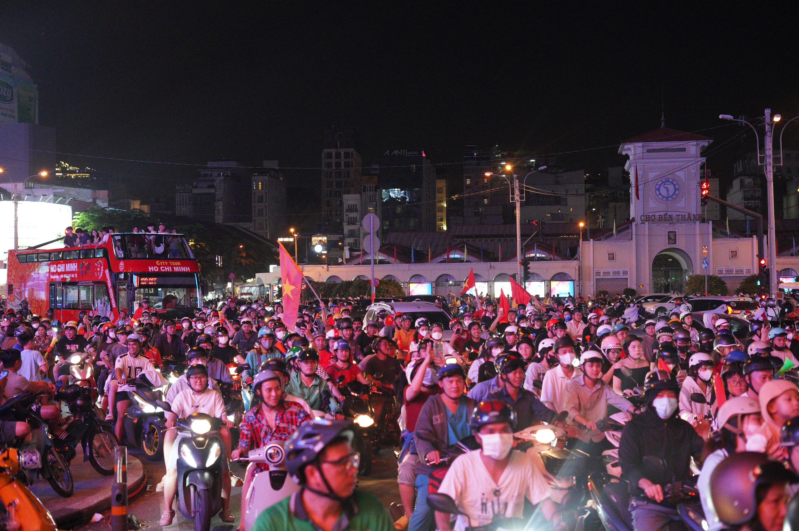 Khu vực chợ Bến Thành người dân di chuyển kín đường, những tiếng hô vang "Việt Nam vô địch" vang vọng khắp nơi
