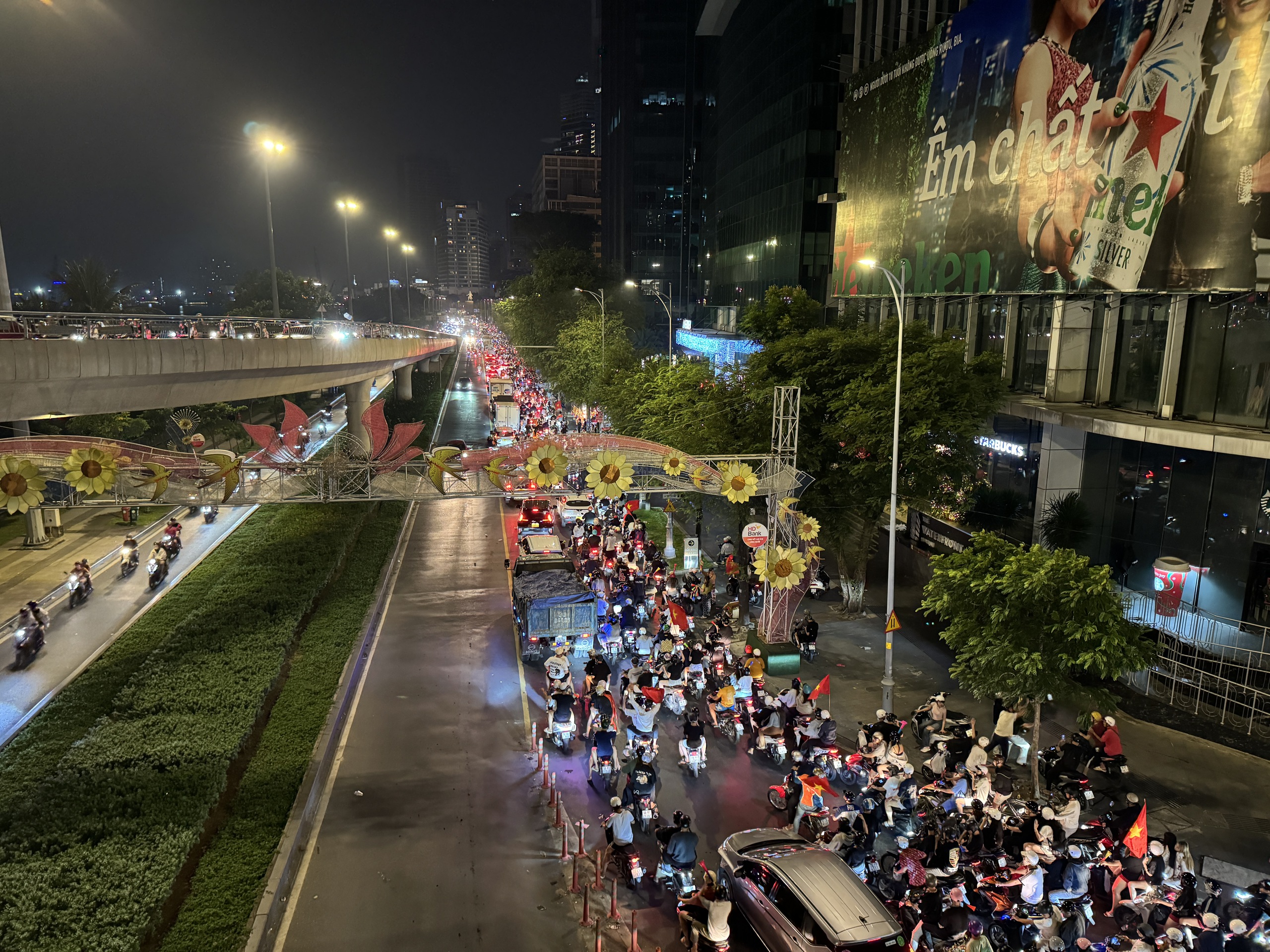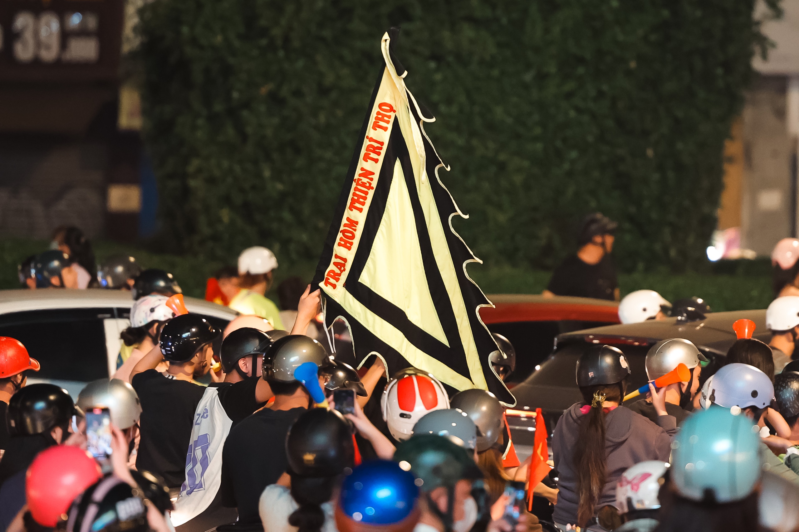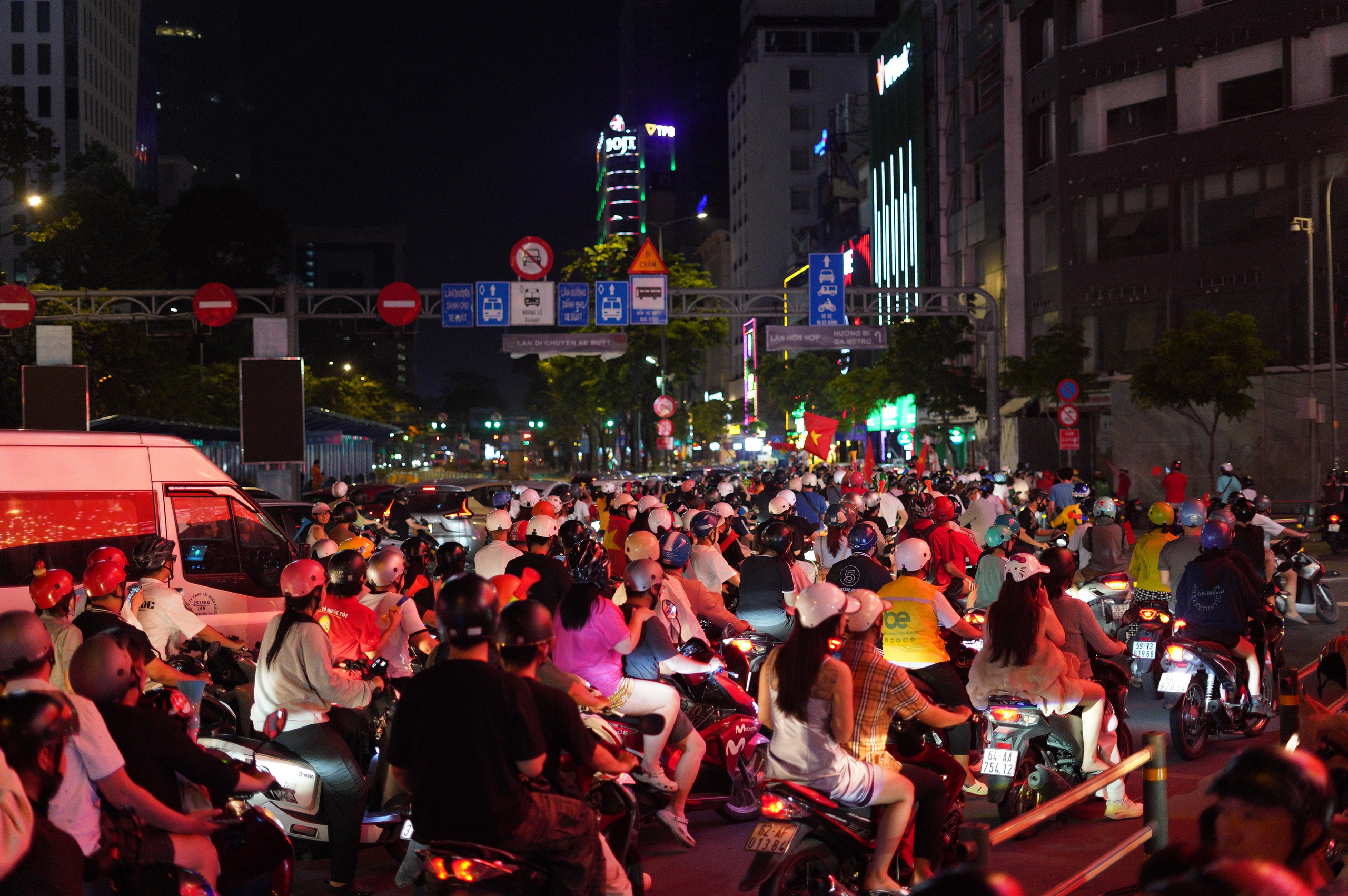 Tại TP.HCM, dọc đường Tôn Đức Thắng, cơn bão ăn mừng chiến thắng vẫn kéo dài, tiếng reo hò, cờ đỏ sao vàng và niềm hân hoan của người hâm mộ tạo nên dư âm chiến thắng rộn ràng chưa từng có.