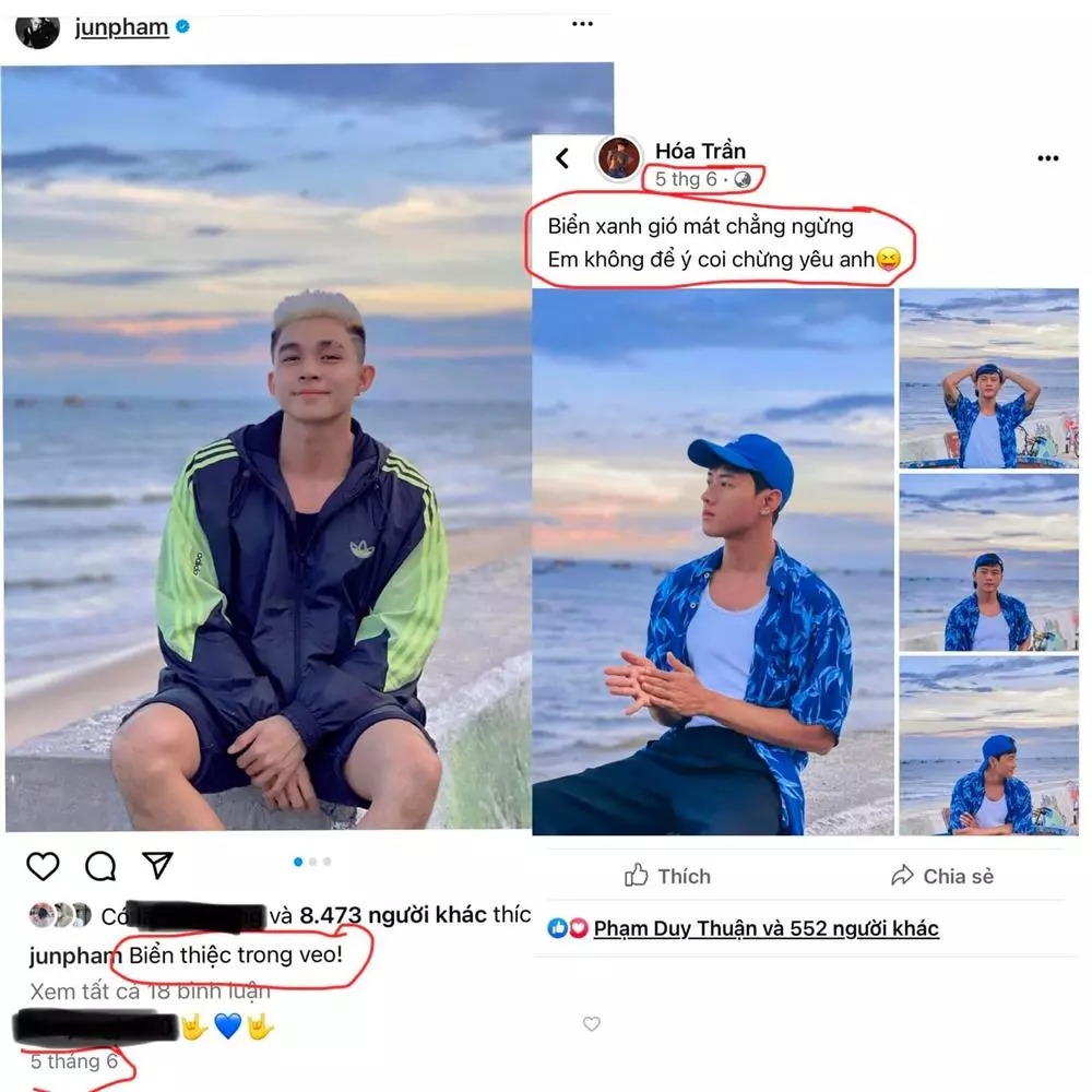 Trên trang cá nhân của cả hai, người hâm mộ phát hiện ra nhiều hình ảnh được chụp cùng một địa điểm và đăng tải sát nhau về thời gian. Bên cạnh đó, Jun Phạm và Hóa Trần còn thường xuyên đăng tải những dòng trạng thái trùng hợp bất ngờ và đậm chất "thả thính". Thậm chí, cả hai còn vướng nghi vấn đang sống cùng một nhà.
