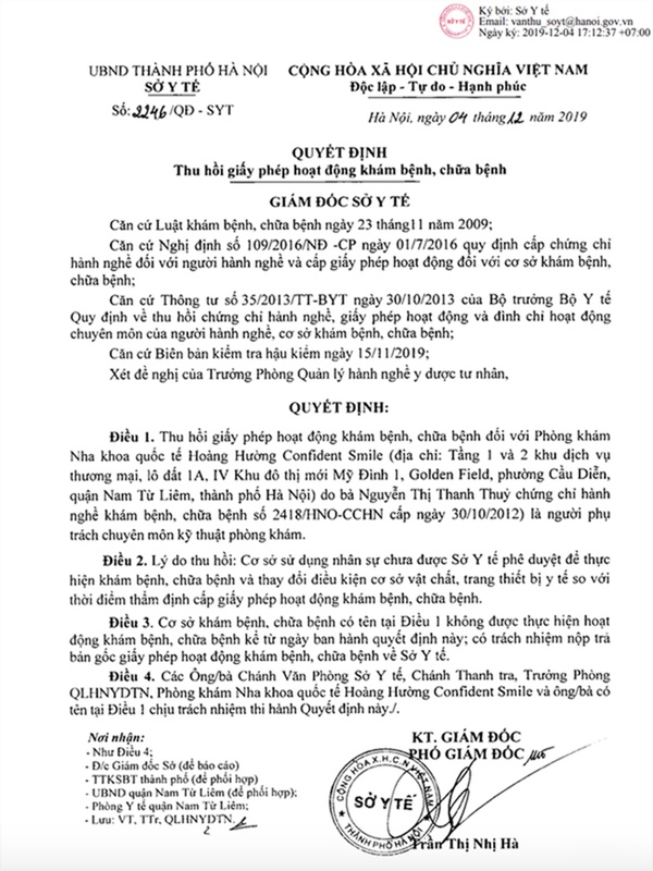 Tuy nhiên, trong quá trình hoạt động năm 2019, phòng khám này từng bị Sở Y tế Hà Nội ban hành quyết định thu hồi giấy phép hoạt động khám bệnh, chữa bệnh. Lý do là phòng khám Nha khoa quốc tế Hoàng Hường Confident Smile sử dụng nhân sự chưa được Sở Y tế phê duyệt để thực hiện khám, chữa bệnh và thay đổi điều kiện cơ sở vật chất, trang thiết bị y tế so với thời điểm thẩm định cấp giấy phép hoạt động khám, chữa bệnh.