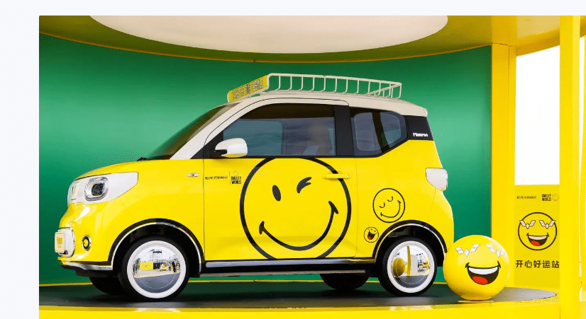 So với thế hệ cũ, Wuling Hongguang MiniEV thế hệ thứ 3 vẫn giữ thiết kế hình hộp nhưng tròn trịa hơn, kết hợp với bộ mâm cỏ 4 lá 12 inch, giá để hành lý trên nóc xe và logo SmileyWorld Macaron độc quyền.