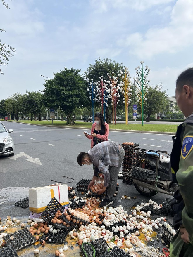 Chị Vũ Phương Trang, cư dân sinh sống tại chung cư ở Gia Lâm (Hà Nội) cho biết, khoảng 11h sáng nay (6/11) khi đi qua sảnh tòa nhà thì gặp nam thanh niên đang nhặt hàng trăm quả trứng bị rơi vỡ ở đường. Chàng trai lúi húi lựa những quả trứng lành lặn còn lại, xếp vào khay.