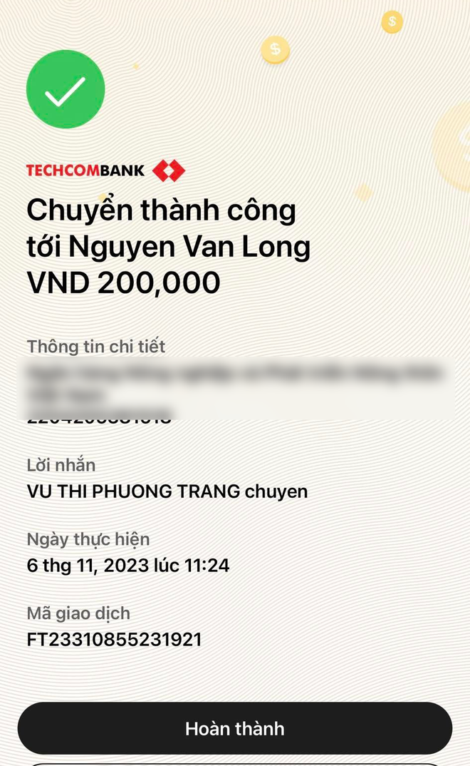 Mình thấy thương nên đỗ xe vòng lại rồi hỏi số tài khoản, chuyển khoản giúp đỡ bạn ấy một chút vì trông rất tội. Ban đầu bạn không dám nhận nhưng có mấy chú bảo vệ gần đó khuyên nên lúc sau mới đồng ý. Mình cũng chỉ biết bạn ấy tên Nguyễn Văn Long”, chị Trang bày tỏ.