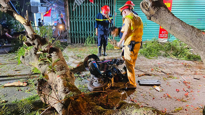 Phần thân cây sau đó rơi xuống đường, trúng một học sinh đi xe đạp điện. Hình ảnh tại hiện trường cho thấy xe đạp điện biến dạng.